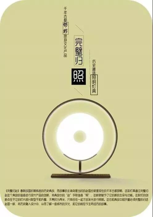 邯郸作为千年古都,有着诸多的历史文化遗产,本次特选出成语“完璧归赵”作为创作要点:历史上蔺相如将完美无瑕的和氏璧,完好地从秦国带回赵国首都,比喻把物品完好地归还物品主人。与包组合,即宣扬了邯郸文化,又代表了美好的祝愿。