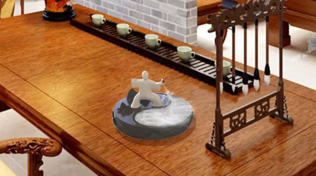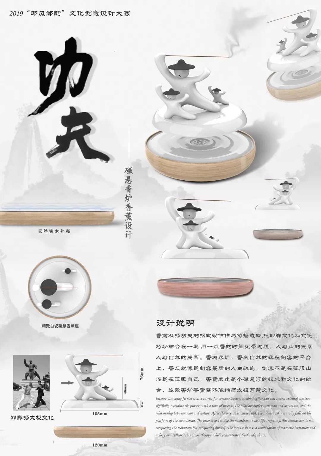 香熏以杨功夫的招式动作作为传播载体,把邯郸文化和文创巧妙结合在一起。用一炷香的时间记录过程,人与山的关系人与自然的关系,香燃尽后,香灰自然地落在剑客的平合上,香灰就像是剑客最后的人生轨迹,剑客不是在征服山而是在征服自己。香薰底座是磁悬浮技术和文化的结合,这款香炉香薰整体浓缩杨太极写意文化。